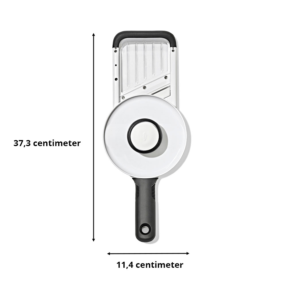 Je pakt de OXO Handmandoline uit de keukenlade. Je haalt de restenhouder eraf en zet met het schuifje het mes open. Je bepaalt zelf of je hem op 1, 2, 3 of 6 millimeter dikte zet. Of op julienne voor een extra bijzonder effect. Vervolgens duw je met de mooie grote restenhouder, die je vingers beschermt, de ingrediënten over het mes. Zo maak je eenvoudig mooie, gelijke plakken aardappel, wortel, appel en julienesliertjes.